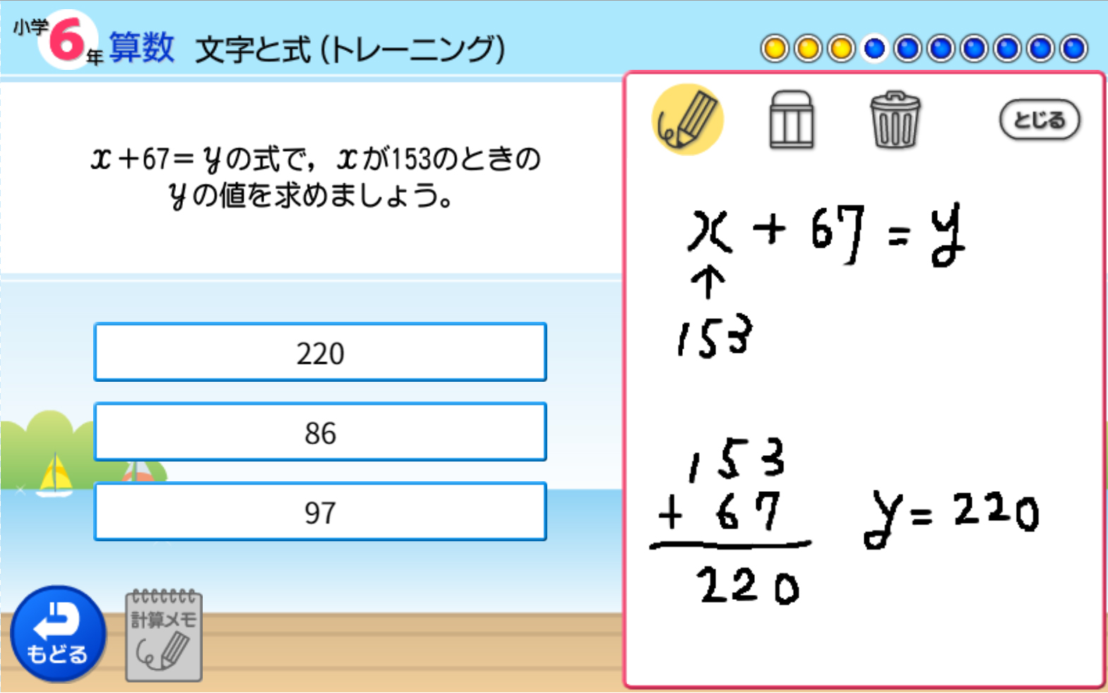 算数の計算問題などにはメモ機能がついており、式を書きながら解くことができます。