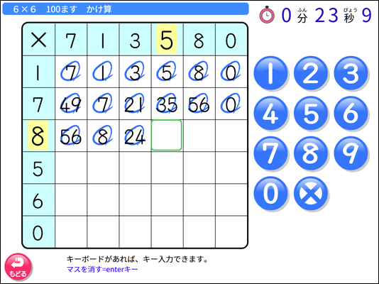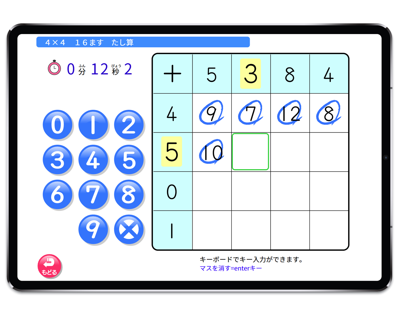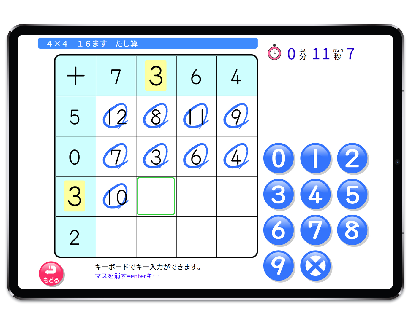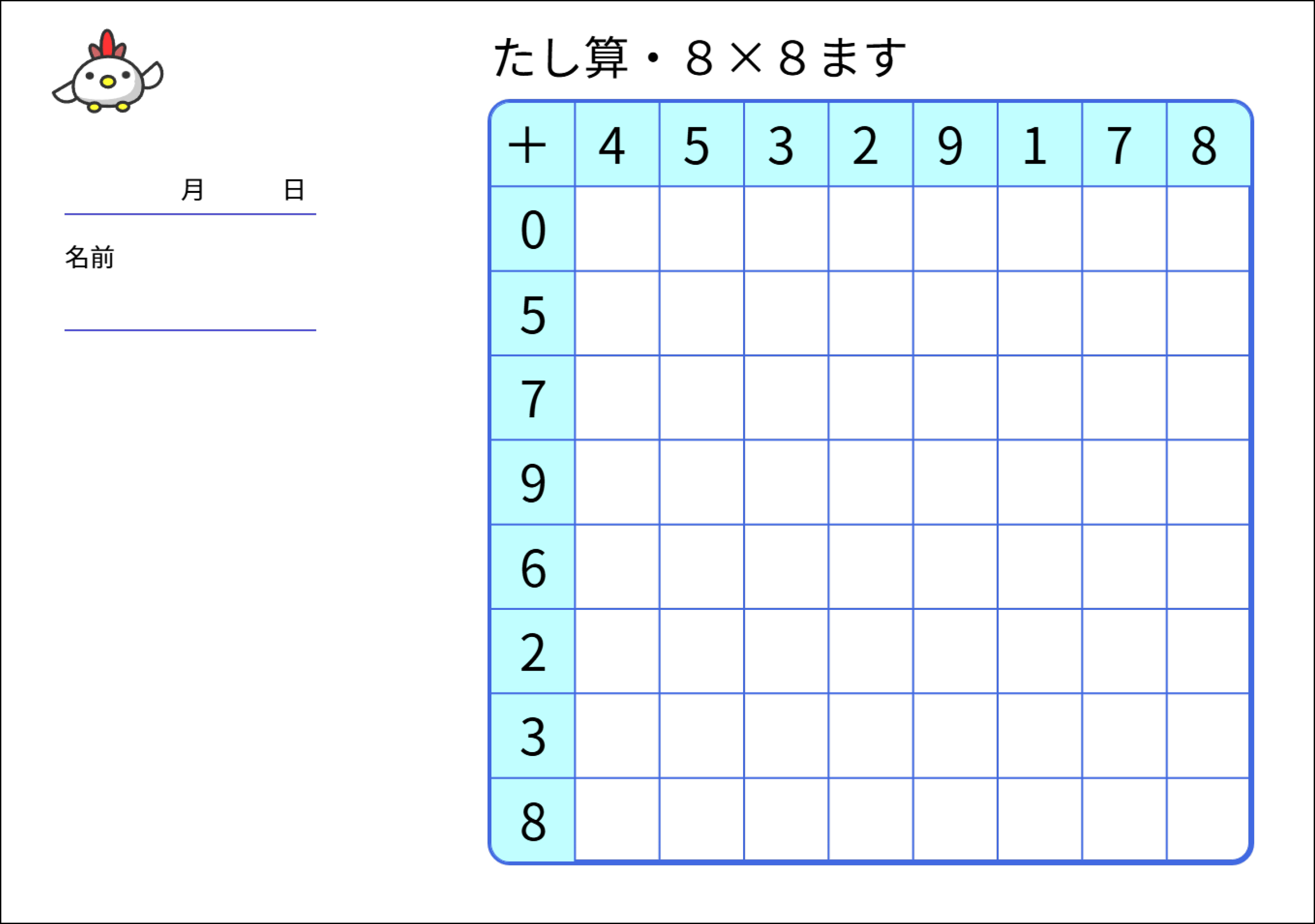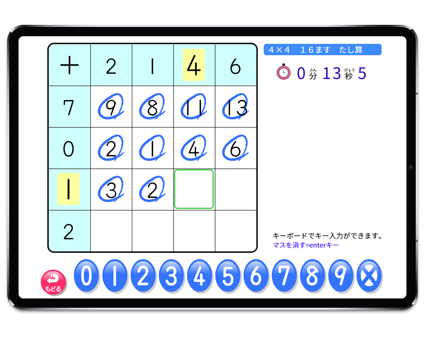 4×4・6×6・8×8・10×10マスの、たし算・わり算・かけ算をそれぞれ選択可能。問題の数字はランダムに入れ替わるので、反復練習や小テストなどに、くり返しご利用いただけます。